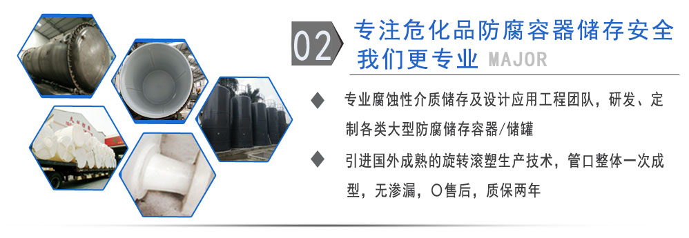 公司有鋼襯塑PE/PO、PE全塑、碳鋼、不銹鋼四大系列100多個品種,專注于常壓儲存容器生產,其產品包括鋼襯塑儲罐、管口一體成型PE儲罐、碳鋼儲罐不銹鋼儲罐、反應釜、攪拌罐、離子交換柱、鋼襯PE/PO儲罐、塑料儲罐、鹽酸儲罐硫酸儲罐等等。更大限度滿足廣大客戶的各種需求,同時可以根據客戶的需要加工定制各種防腐設備。
